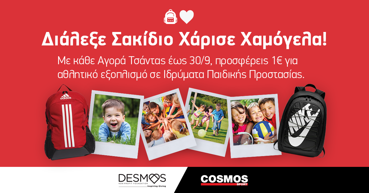 Φέτος, το καινούριο σας σακίδιο μπορεί να κάνει κάτι σπουδαίο! Απλώς διάλεξε από το Cosmossport.gr ή από τα 26 Καταστήματα Cosmos Sport το σακίδιο που θα συνοδεύει εσένα ή τα παιδιά σου στη νέα σχολική χρονιά, κι εμείς θα δώσουμε 1€ από την αγορά σου για τον αθλητικό εξοπλισμό σε 3 επιλεγμένα Ιδρύματα Παιδικής Προστασίας